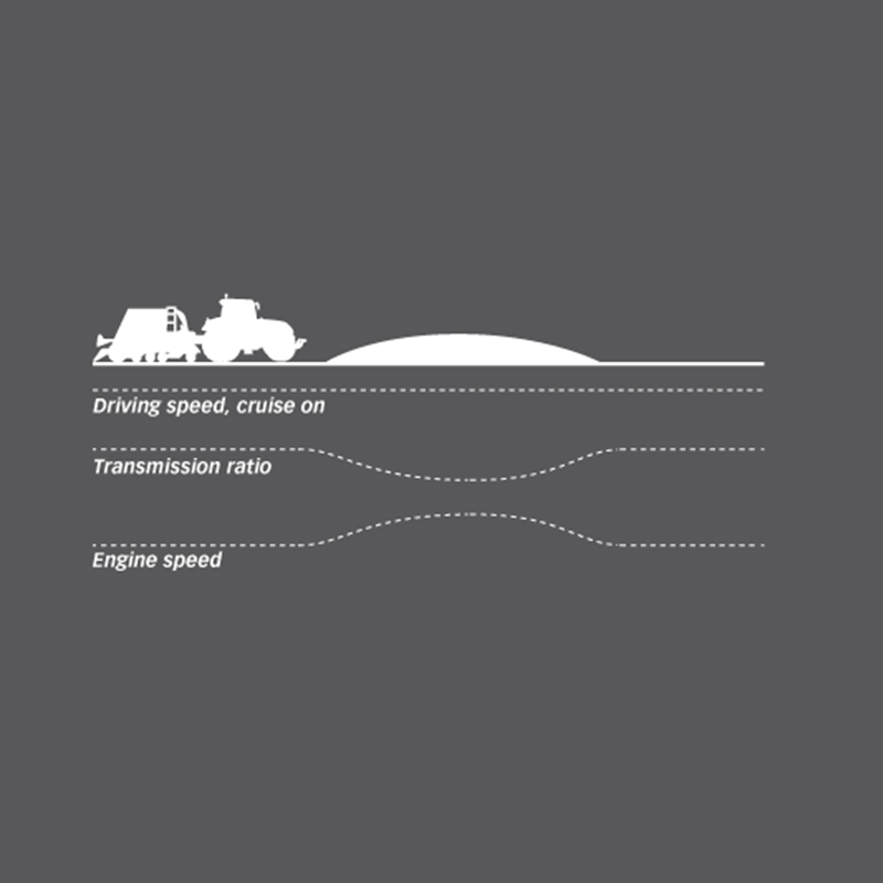 Automatic mode is the default setting when starting the engine. The operating principle is simple: automatic mode uses the highest possible transmission ratio to optimise fuel economy. For example, when pulling a load in difficult terrain, the transmission adjusts the ratio (engine speed) to maintain a constant ground speed. This can be adjusted by the droop setting, whether fuel saving or ultimate efficiency are needed.